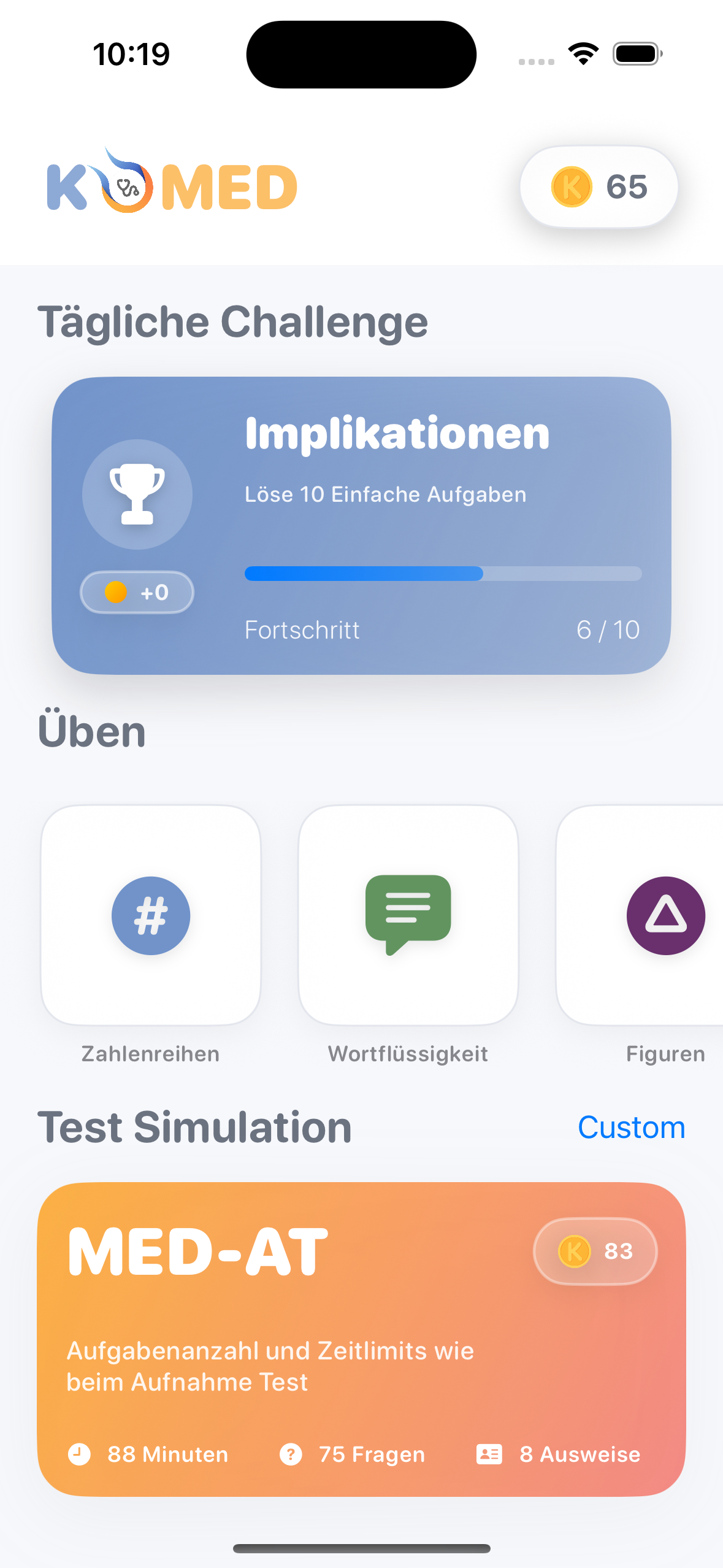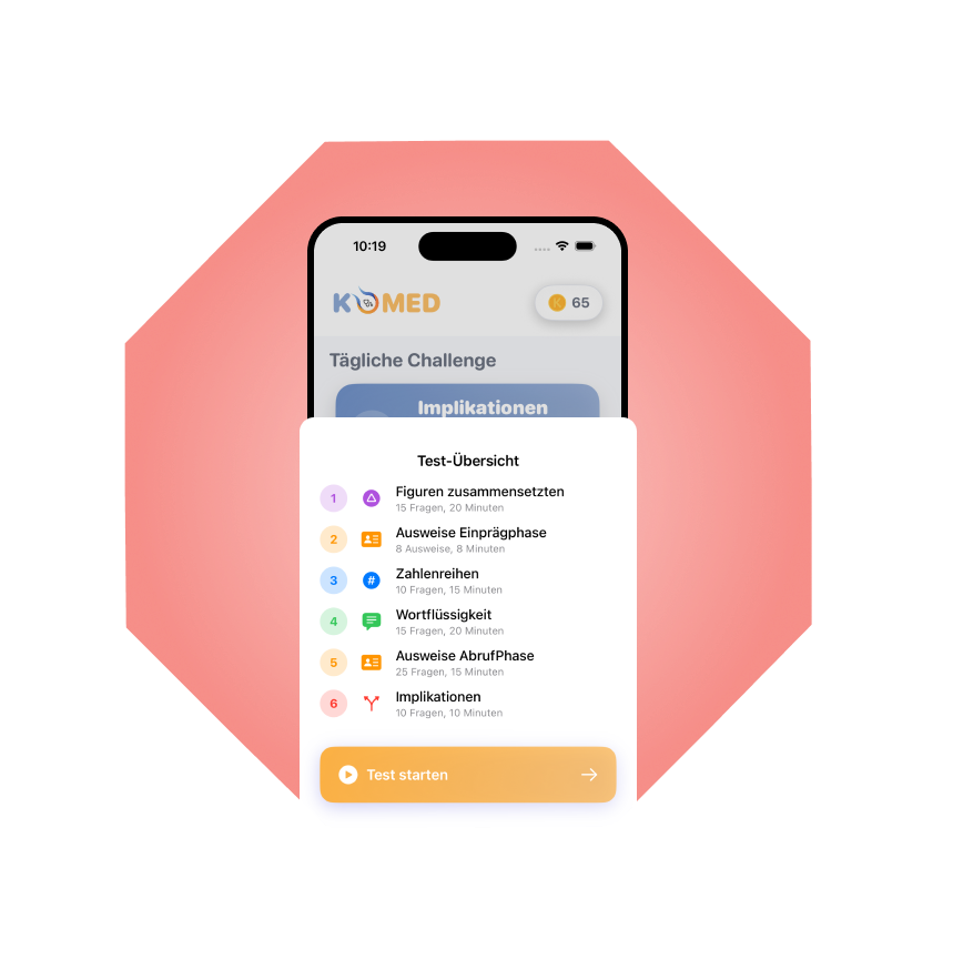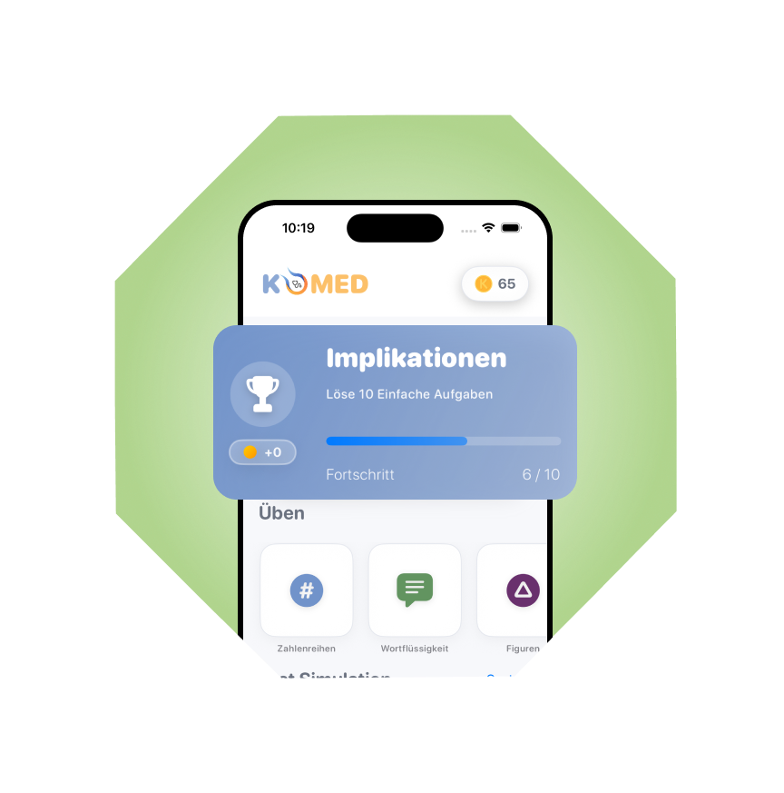 Komed ist eine moderne Lern- und Trainingsapp für die gezielte Vorbereitung auf den kognitiven Teil des MedAT. Trainiere Zahlenreihen, Wortflüssigkeit, Figuren, Implikationen und Merkfähigkeit realistisch und effizient.