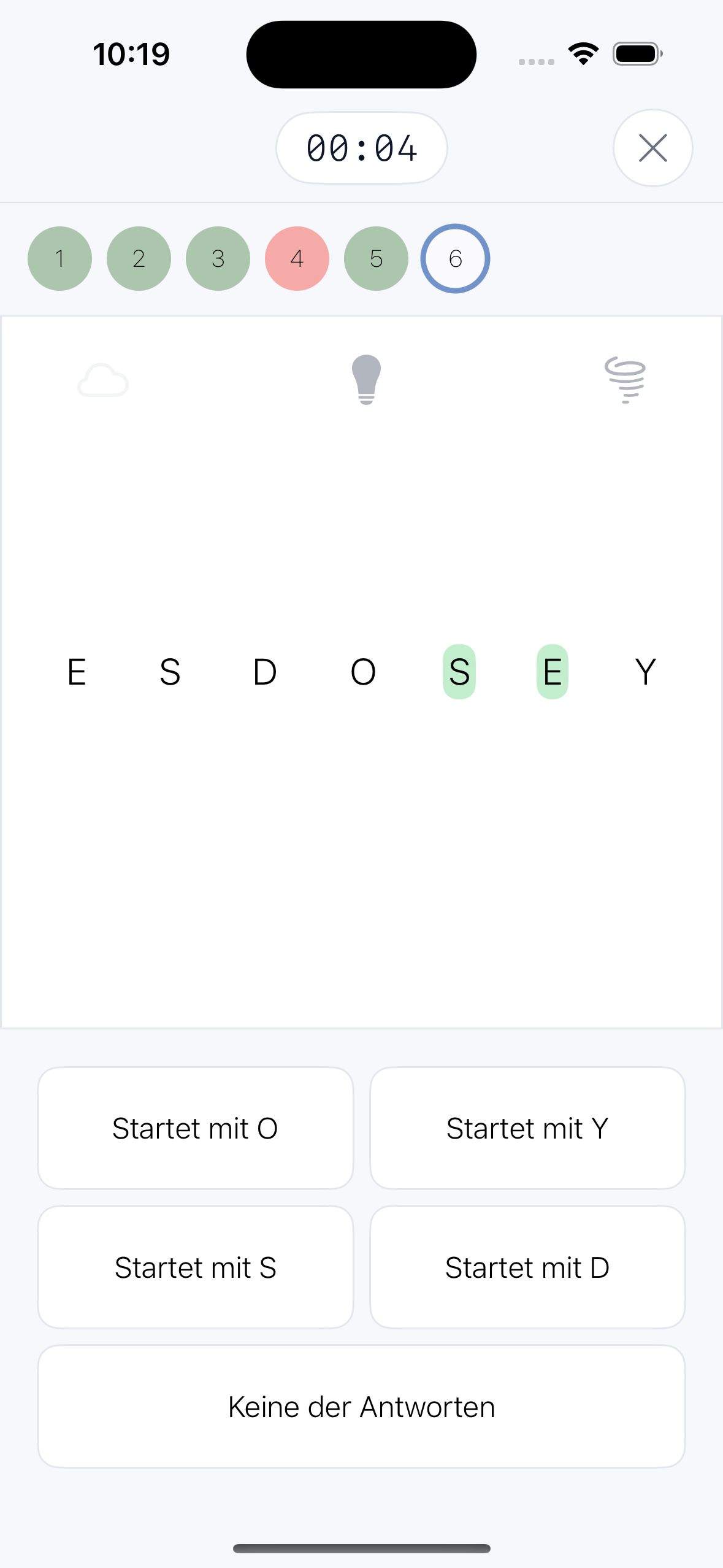Du siehst die Buchstaben eines Wortes in zufälliger Reihenfolge und musst erkennen, mit welchem Buchstaben das ursprüngliche Wort beginnt.